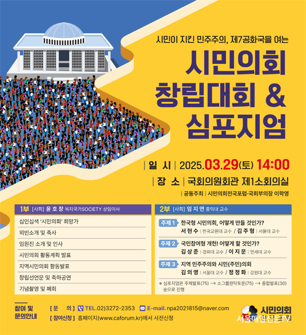 ±è¼­Áß ±âÀÚ / ¿À´Â 3¿ù 29ÀÏ(Åä) ¿ÀÈÄ 2½Ã, ±¹È¸ÀÇ¿øÈ¸°ü Á¦1¼ÒȸÀǽǿ¡¼­ ÀÌÇпµ ±¹È¸ºÎÀÇÀå°ú °øµ¿ÁÖÃÖ·Î ¡®½Ã¹ÎÀÇȸ Àü±¹Æ÷·³¡¯ÀÇ Ã¢¸³´ëȸ ¹× ±â³ä½ÉÆ÷Áö¾öÀÌ °³ÃֵȴÙ. À̹ø Çà»ç¿¡´Â Àü±¹ ½Ã¹ÎÀÇȸ Áö¿ªÆ÷·³ ȸ¿ø 100¿©¸íÀÌ Âü¿©ÇÒ ¿¹Á¤ÀÌ´Ù.