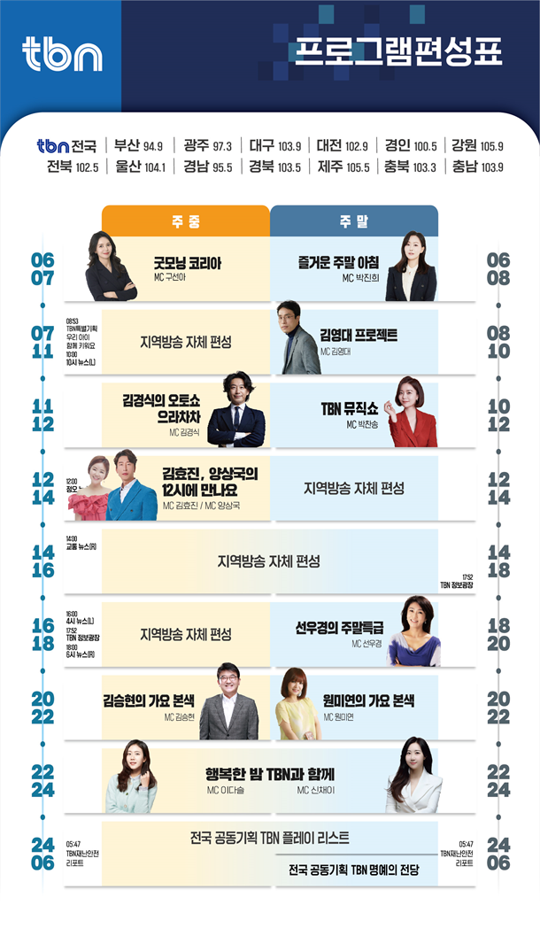 À̹ø °³Æí¿¡¼­´Â ±¸¼±¾Æ ¾Æ³ª¿î¼­°¡ ¡®±Â¸ð´×ÄÚ¸®¾Æ(ÁÖÁß 06:00~06:55)¡¯ÀÇ ÁøÇàÀÚ·Î º¹±ÍÇϰí, ±âÁ¸ ¹ÚÁøÈñ ÁøÇàÀÚ´Â ¡®Áñ°Å¿î ÁÖ¸» ¾ÆÄ§(ÁÖ¸» 06:00~07:55)¡¯À¸·Î ÀÚ¸®¸¦ ¿Å±ä´Ù. À̾î ÁÖ¸» ¿ÀÀü 10½Ã¿¡´Â ¹ÚÂù¼Û ÁøÇàÀÚ°¡ ¡®TBN¹ÂÁ÷¼î¡¯¸¦ ¼±º¸ÀδÙ.