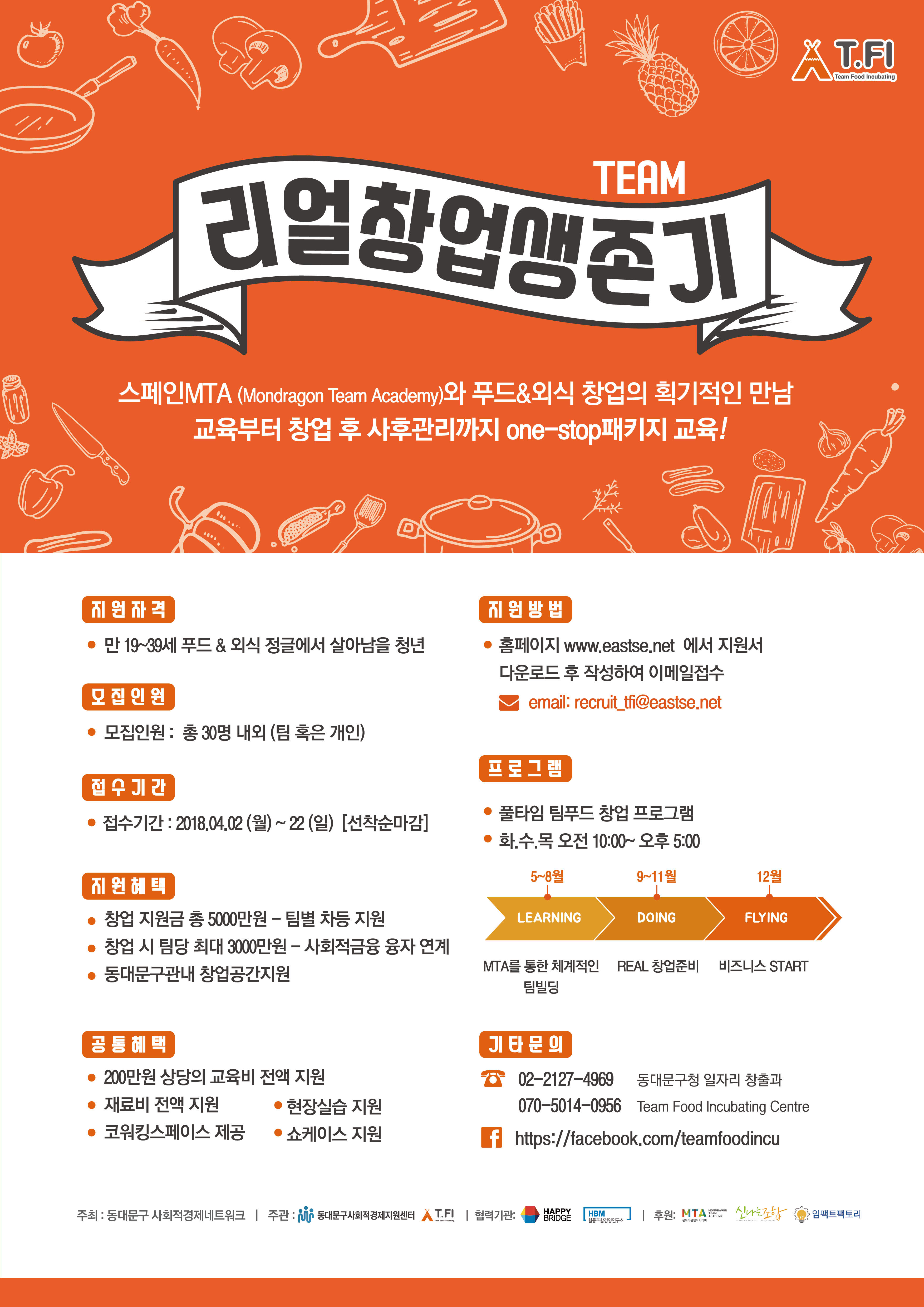 ¿ÃÇØ ÃʺÎÅÍ ½ÃÀÛµÈ À̹ø »ç¾÷Àº ¿Ü½Ä â¾÷À» Èñ¸ÁÇϴ û³âµéÀ» ´ë»óÀ¸·Î ¿Ü½Ä¾÷ ½Ç¹« ±âÃʱ³À°ºÎÅÍ ¸Þ´º°³¹ß, ÀÎÅϽǽÀ±âȸ±îÁö »ç¾÷¿î¿µ ³ëÇϿ츦 ¾Ë·ÁÁÖ°í û³ââ¾÷ ¿ª·®À» Ű¿ì´Â »ç¾÷ÀÌ´Ù. â¾÷ ¾ÆÀ̵ð¾î¸¦ °¡Áø û³âµéÀº ÁÖ¹æ½Ã¼³ µî ¿Ü½Ä¾÷ ¼³ºñ°¡ °®ÃçÁø ½Ç½À½Ç°ú ±³À°½Ç¿¡¼­ ÀÓÂ÷·á ºÎ´ã ¾øÀÌ Ã¢¾÷±âȹ¿¡ ´ëÇÑ ½ÇÀü °æÇèÀ» ÇØº¼ ¼ö ÀÖ´Ù. ¸¸19~39¼¼ÀÇ ¿Ü½Äâ¾÷À» Èñ¸ÁÇϴ û³âÀº ´©±¸³ª Áö¿ø °¡´ÉÇÏ´Ù. ¸ðÁýÀοøÀº ÃÑ 30¿©°³ÀÇ ÆÀ ¶Ç´Â °³ÀÎÀ¸·Î 22ÀϱîÁö ¼±Âø¼ø ¸¶°¨À¸·Î www.eastse.net¿¡¼­ Áö¿ø¼­¸¦ ´Ù¿î ¹ÞÀº ÈÄ À̸ÞÀÏÀ» ÅëÇØ ½ÅûÇÏ¸é µÈ´Ù.