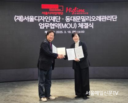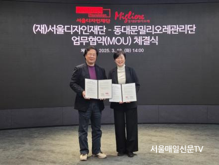 ¡ã ¼­¿ïµðÀÚÀÎÀç´Ü Â÷°­Èñ ´ëÇ¥ÀÌ»ç¿Í µ¿´ë¹®¹Ð¸®¿À·¹°ü¸®´Ü ±è¸í¼÷ °ü¸®ÀÎÀÌ ¾÷¹«Çù¾à¼­¿¡ ¼­¸íÇÑ ÈÄ ±â³äÃÔ¿µÀ» Çϰí ÀÖ´Ù. »çÁøÁ¦°ø=¼­¿ïµðÀÚÀÎÀç´Ü
