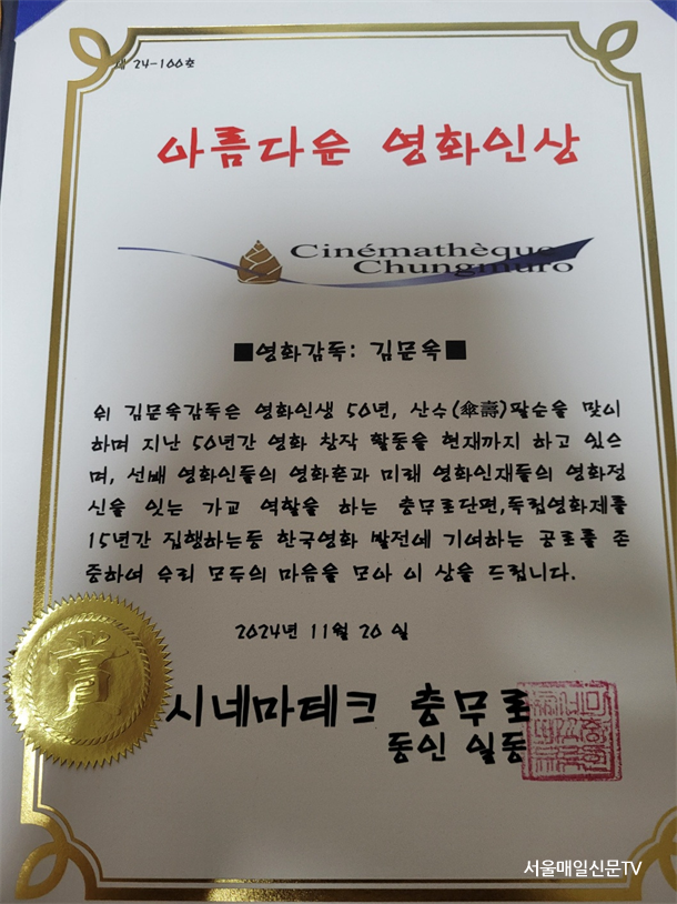±è¼­Áß ±âÀÚ / Áö³­ 11¿ù 20ÀÏ, È«´ë ¾Õ KT&G »ó»ó¸¶´ç ½Ã³×¸¶¿¡¼­ ¿­¸° ¿µÈ­ '¹Îµé·¹' ½Ã»çȸ¿¡¼­ ±è¹®¿Á °¨µ¶ÀÌ ÆÈ¼øÀ» ¸ÂÀÌÇÏ¿© ½Ã³×¸¶Å×Å© Ãæ¹«·Î µ¿ÀÎ Àϵ¿À¸·ÎºÎÅÍ ¡®¾Æ¸§´Ù¿î ¿µÈ­Àλó¡¯À» ¼ö»óÇß´Ù. ÀÌ »óÀº µ¿ÀÎ ´ëÇ¥ÀÎ ¼Õ¿µÈ£ °¨µ¶ÀÌ ±è °¨µ¶¿¡°Ô Á÷Á¢ ¼ö¿©ÇÏ¿´´Ù.