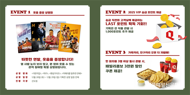 À̹ø ±âȹ »ó¿µÀüÀº 12¿ù 27ÀϺÎÅÍ 30ÀϱîÁö 4Àϰ£ ¾¾³×Q ½Åµµ¸²Á¡ ¾¾³×ÇÊ 9°ü¿¡¼­ ÁøÇàµÇ¸ç, ¹Ï°í º¸´Â Äڹ̵𠿵ȭ¸¦ ÅëÇØ ¿¬¸» Àü °ÆÁ¤°ú ±Ù½ÉÀ» Åо ±âȸ¸¦ Á¦°øÇÑ´Ù.